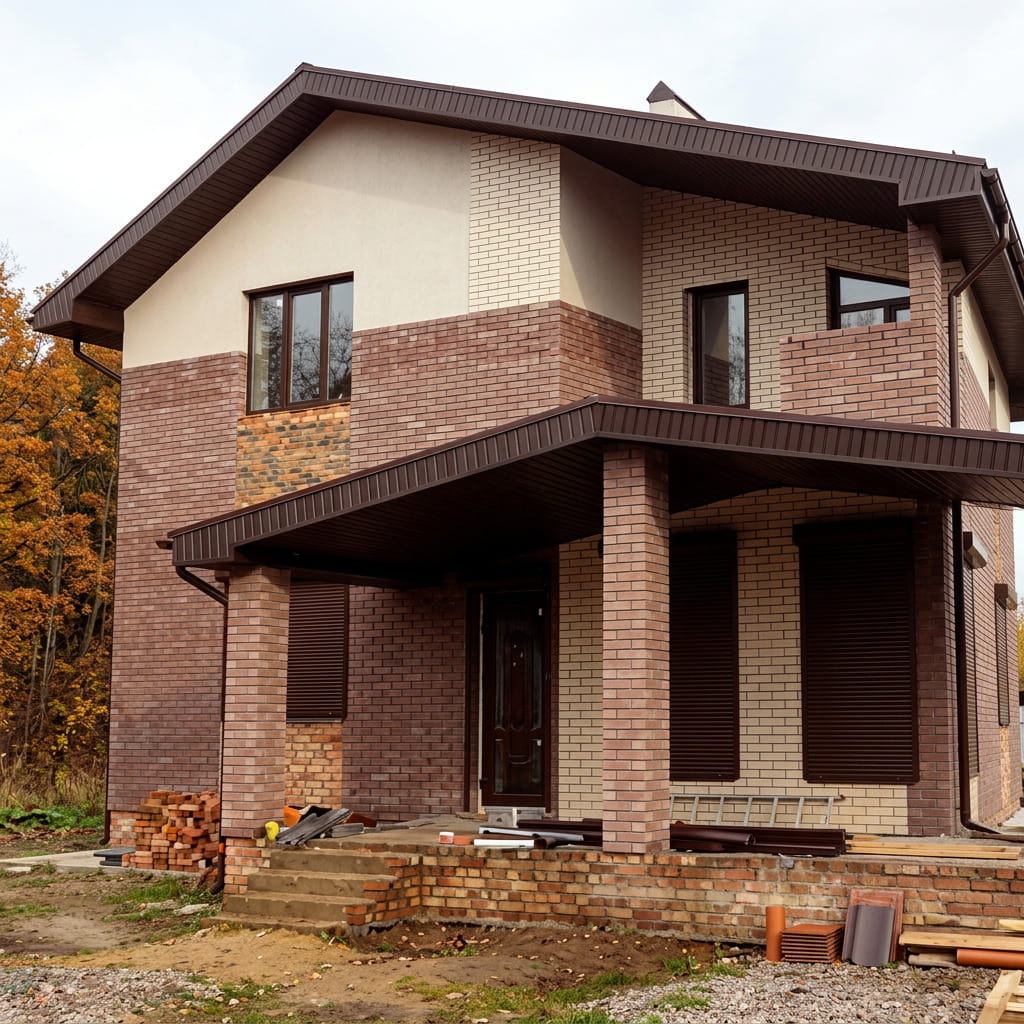 Отделка фасада может проводиться на этапе кладки стен (для облицовочного кирпича) или после возведения короба и крыши. Монтаж дверей и окон выполняется с устройством отливов и откосов, подшивкой свесов и монтажом водосточной системы.