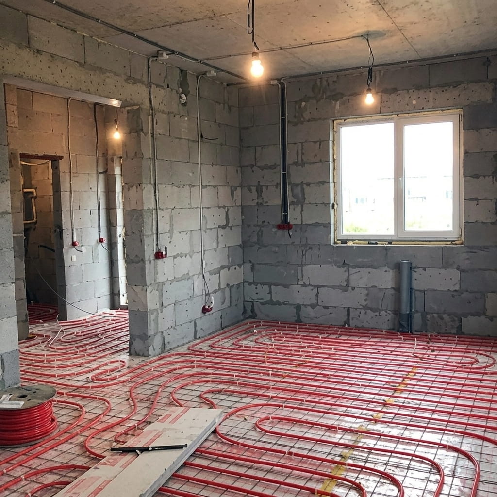Инженерные сети прокладываются до или одновременно с черновой отделкой. Выполняется монтаж труб, радиаторов, системы «тёплый пол», устанавливается котельное оборудование, прокладываются трубы водоснабжения и канализации, проводится разводка электрокабелей с тестированием оборудования.