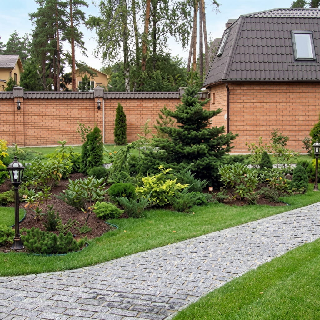 Обустройство дорожек, малых искусственных водоёмов, альпийских горок, беседок и других малых архитектурных форм. При озеленении участка учитываются особенности растений, их потребности в воде и солнце. Помогает профессиональный ландшафтный дизайнер.